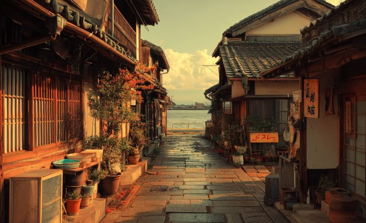夕暮れ時、地方都市の古びた商店街から一本 …